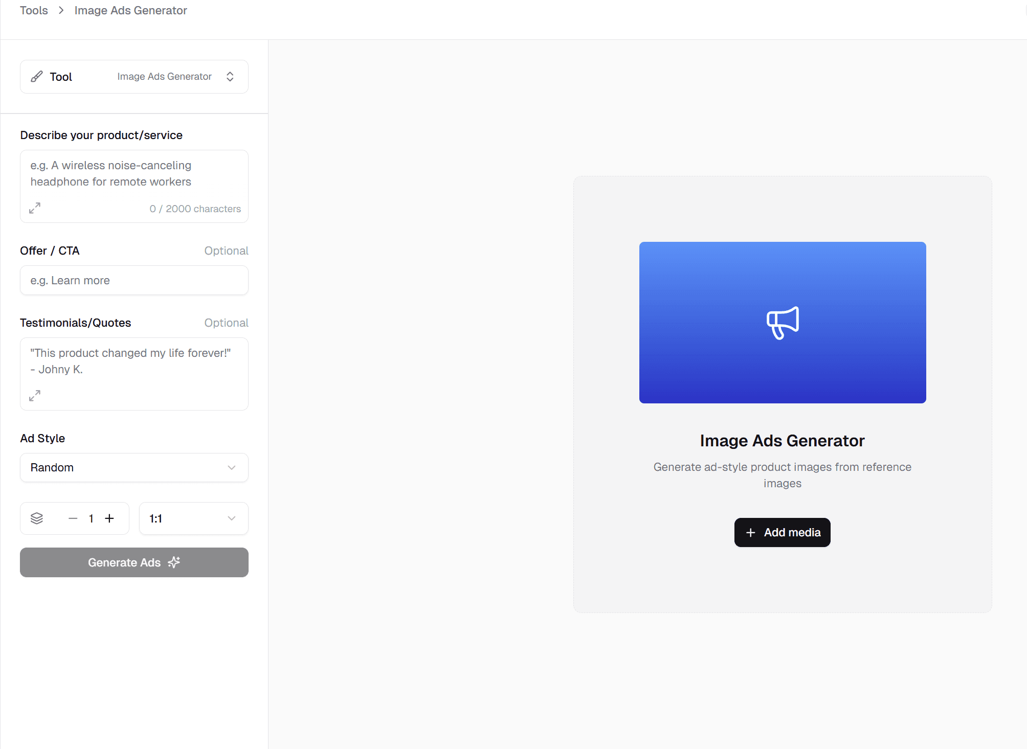 The Image Ad Generator reflects a different priority. It is built from a marketing perspective, where the goal is not simply to produce images, but to produce assets that contribute to campaign performance.