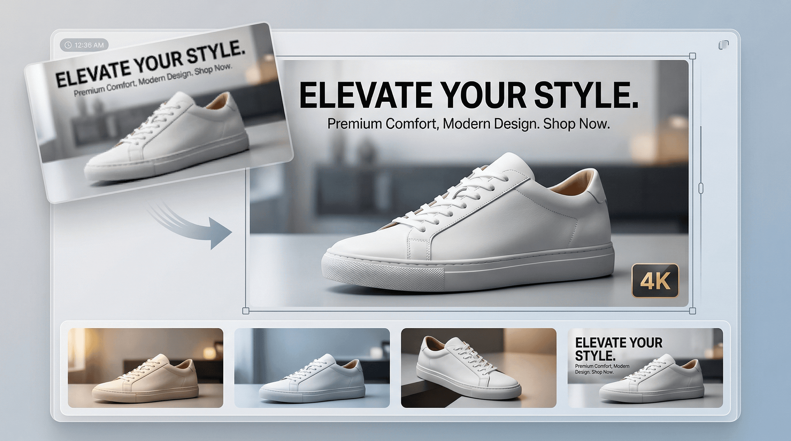 The wrong tool can provide inadequate assets. Blurry visuals. Soft edges. Lost detail. Kreator restores clarity and detail so your assets hold up across ads, product pages, and high-resolution formats.
